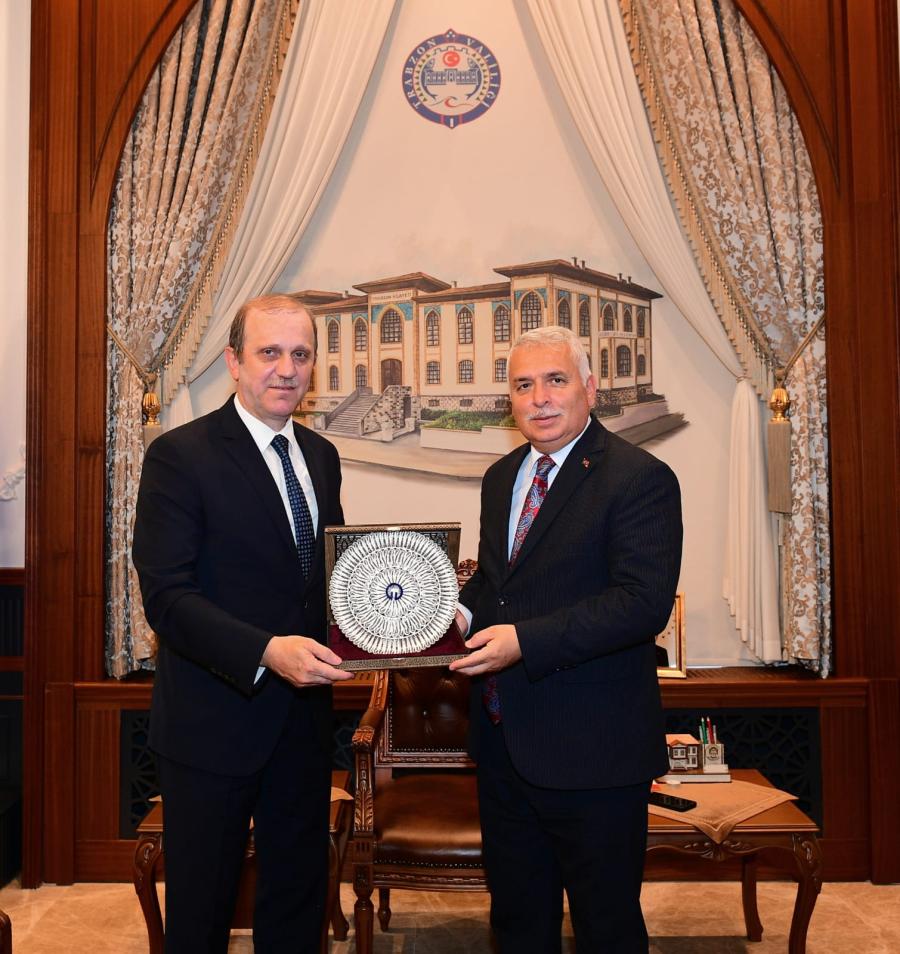 Rektörümüz Prof. Dr. ÇUVALCI, Rektör Yardımcıları Prof. Dr. Akif CİNEL ve Prof. Dr. Halil İbrahim OKUMUŞ ile birlikte gerçekleştirdiği ziyarette, Vali YILDIRIM’a yeni görevinin hayırlı olması temennisinde bulundu. Ziyaret sırasında, Karadeniz Teknik Üniversitesi'nin Trabzon şehriyle olan iş birliği ve dayanışmasının önemi ele alındı. Rektörümüz; üniversite ve şehir arasındaki güçlü bağa vurgu yaparak, Karadeniz Teknik Üniversitesi'nin (KTÜ) kentin kalkınmasına ve gelişimine katkı sağlayan köklü bir kurum olduğunu ifade etti. Prof. Dr. ÇUVALCI, üniversite olarak kentte önemli projeler ve çalışmalar yapabileceklerine olan inancını dile getirdi.