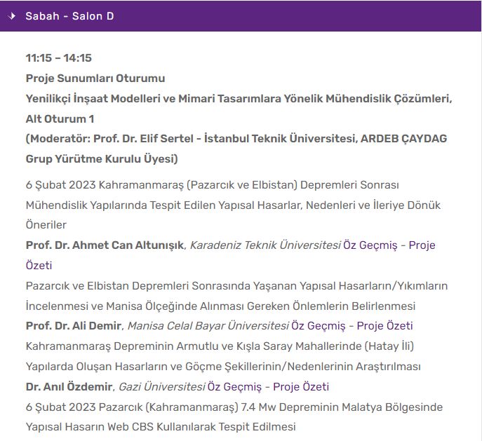 Konferansta depremlerin sonrasında hemen açılan TÜBİTAK 1002-C Doğal Afetler Odaklı Saha Çalışması Acil Destek Programı kapsamında desteklenen 124 proje ile 1001 Deprem Özel Çağrısı kapsamında desteklenen 79 proje ele alınacak.