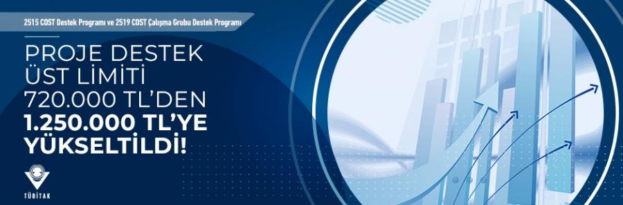 2515 COST Destek Programı ve 2519 COST Çalışma Grubu Destek Programı destek üst limitleri güncellendi. Bu doğrultuda söz konusu programlarda uygulanan proje destek üst limiti 720.000 TL’den 1.250.000 TL’ye yükseltildi.