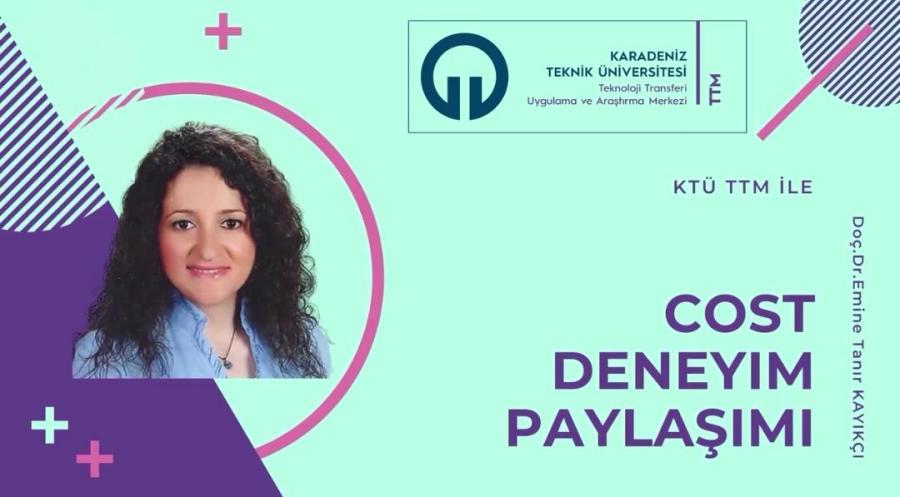 KTÜ-TTM tarafından son aylarda özellikle üzerinde durulan "COST Aksiyonları"na Çalışma Grubu Üyesi(WG) ve/veya Yönetim Komitesi Üyesi (MC) olarak katılımın faydalarını ve edindiği deneyimleri bizimle paylaşan Üniversitemizin Değerli Öğretim Üyesi Emine TANIR KAYIKÇI'ya teşekkür ederiz.