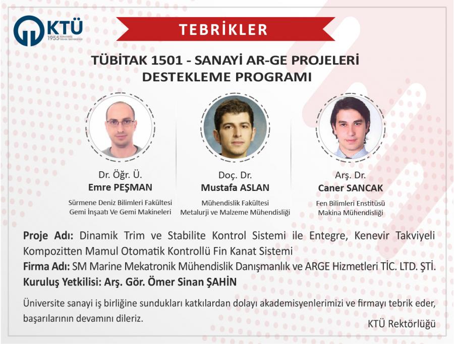 SM Marine Mekatronik Mühendislik Danışmanlık ve ARGE Hizmetleri TİC. LTD. ŞTİ. firmasının yürütücü olduğu ve Üniversitemiz araştırmacılarından Doç. Dr. Mustafa ASLAN, Dr. Öğr. Üyesi Emre PEŞMAN ve Arş. Gör. Caner SANCAK‘ın araştırmacı olarak yer aldığı TÜBİTAK 1501 Sanayi Ar-Ge Projeleri Destekleme Programı Çağrısı'na sunulan "Dinamik Trim ve Stabilite Kontrol Sistemi ile Entegre, Kenevir Takviyeli Kompozitten Mamul Otomatik Kontrollü Fin Kanat Sistemi" başlıklı projesi destek almaya hak kazanmıştır.